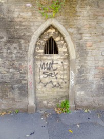 Not too sure this was ever a door, but a pretty forboding bricked in space, Easton, Bristol, July 2020 – a little bit of graffiti (nut sax) just to spice it up a litttle.