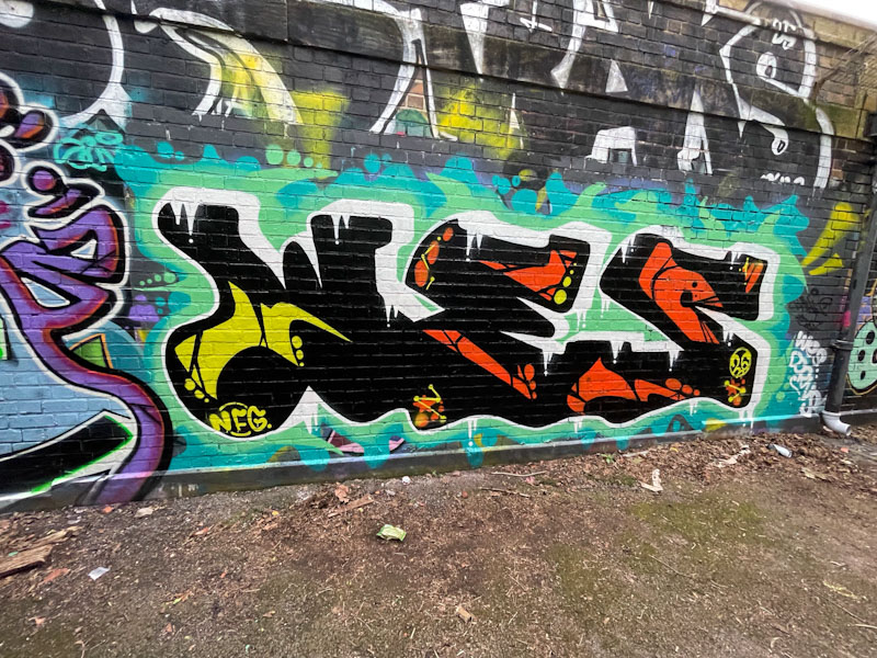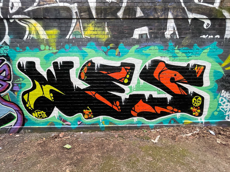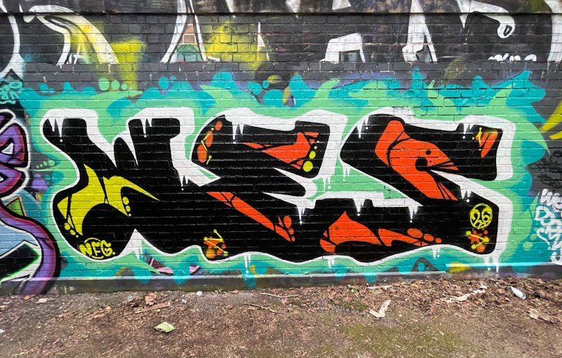 This is a very bold piece heavily filled with black paint and incorporating flashes of red and yellow. It is quite unusual to see work quite so heavily dominated with black paint, but Wes gets away with it here by including a white drop shadow and contrasting blue/turquoise backdrop. Interesting piece from Wes.