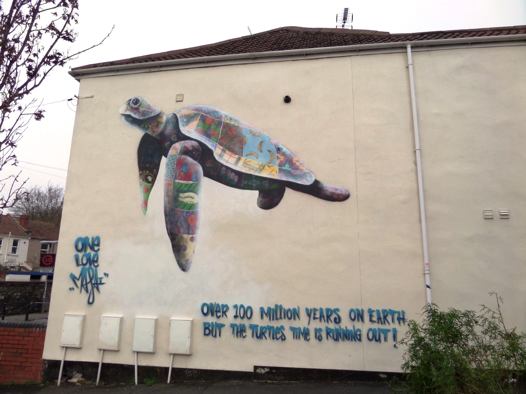 In all honesty, the photographs don’t do this piece justice at all, because the colours and detail are a little lost. It might have been better to zoom in on different elements of the mural to convey the artwork more fully. If you look carefully, you might spot a turtle, an octopus, a manta ray, an ammonite and a manatee with a football pitch on its back. Each of the animals is crafted with Andy Council’s technique of stitching component parts together to create a recognisable whole. A great mural.